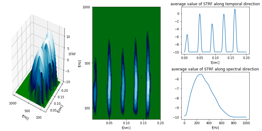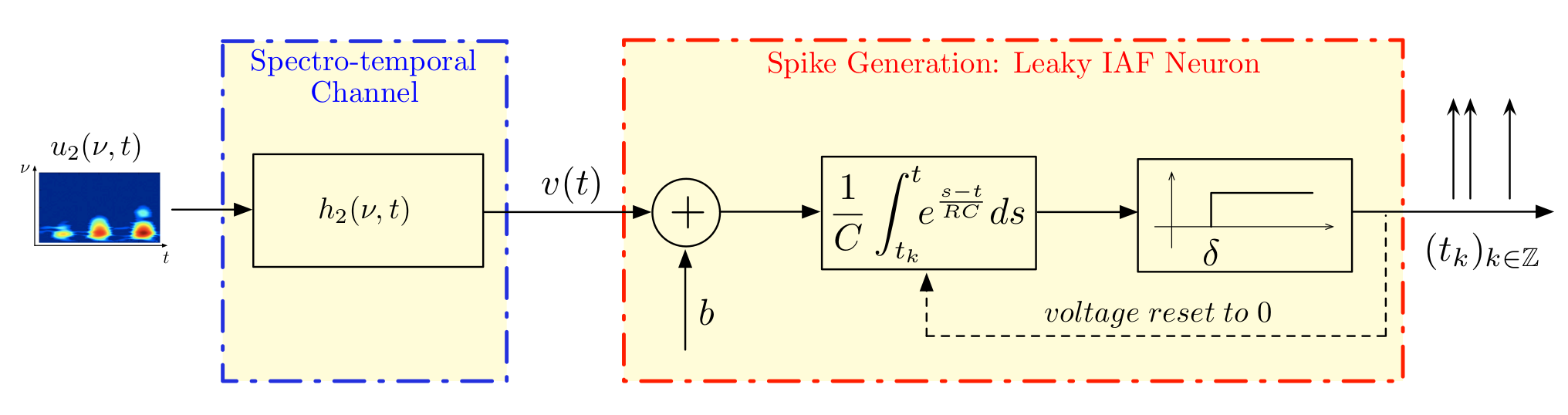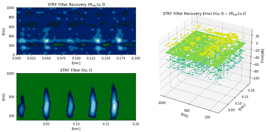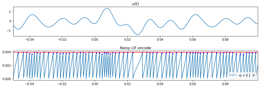 In one of my favorite classes we were asked as a final project to create a neural encoder utilizing a spectrotemporal filter and array of Noisy Leaky IAF "trigger and fire" neurons. The leaky IAF is an encoder of a signal into a train of spikes that is meant to approximate the traditional Hodgkin and Huxley neuron quite well by preserving the nonlinear nature of the Hodgkin and Huxley neuron without the sacrifice of needless computation time. In this way neurons translate amplitude signals into a frequency based sampling space.